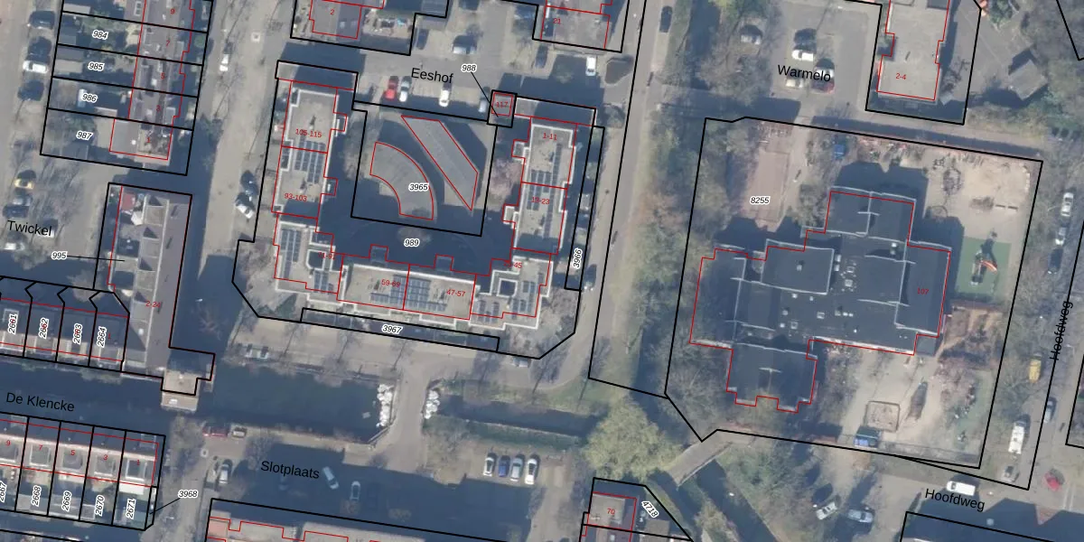 Het perceel waarop Eeshof 41 staat heeft een oppervlakte van 2045 m². Dit is een zeer groot perceel. De perceeloppervlakte wordt geregistreerd door het Kadaster. Gedetailleerde informatie over de maten van dit perceel kunt u vinden in het rapport Kadastrale kaart met maatvoering van Eeshof 41.