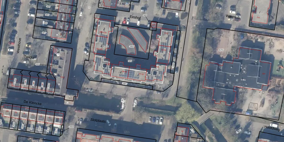 Het perceel waarop Eeshof 47 staat heeft een oppervlakte van 2045 m². Dit is een zeer groot perceel. De perceeloppervlakte wordt geregistreerd door het Kadaster. Gedetailleerde informatie over de maten van dit perceel kunt u vinden in het rapport Kadastrale kaart met maatvoering van Eeshof 47.