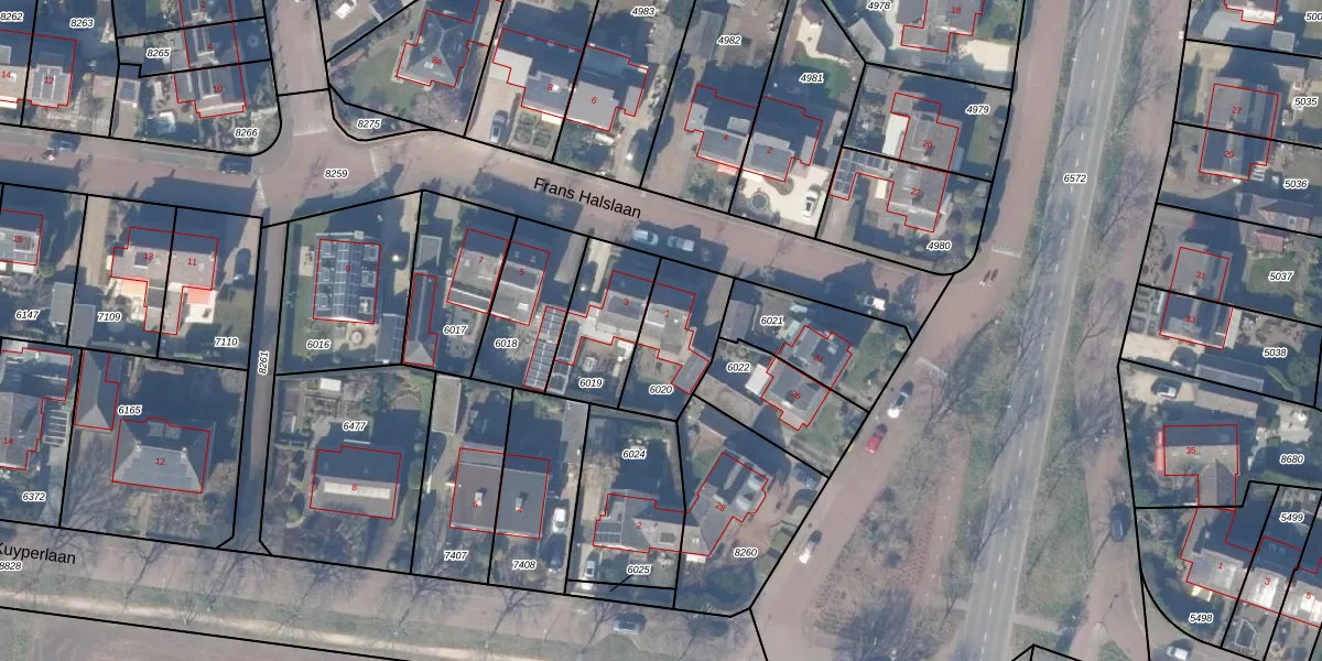 Frans Halslaan 1 is gelegen op kadastraal perceel HZN00B6020. Deze kadastrale aanduiding is uniek en wordt gebruikt door het Kadaster om eigendomsrechten en andere zakelijke rechten vast te leggen. Het perceel maakt onderdeel uit van de kadastrale gemeente Huizen.