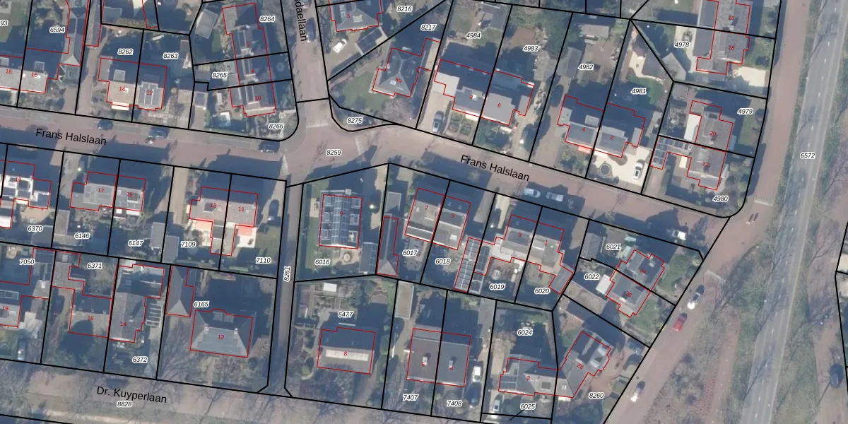 Frans Halslaan 7 is gelegen op kadastraal perceel HZN00B6017. Deze kadastrale aanduiding is uniek en wordt gebruikt door het Kadaster om eigendomsrechten en andere zakelijke rechten vast te leggen. Het perceel maakt onderdeel uit van de kadastrale gemeente Huizen.