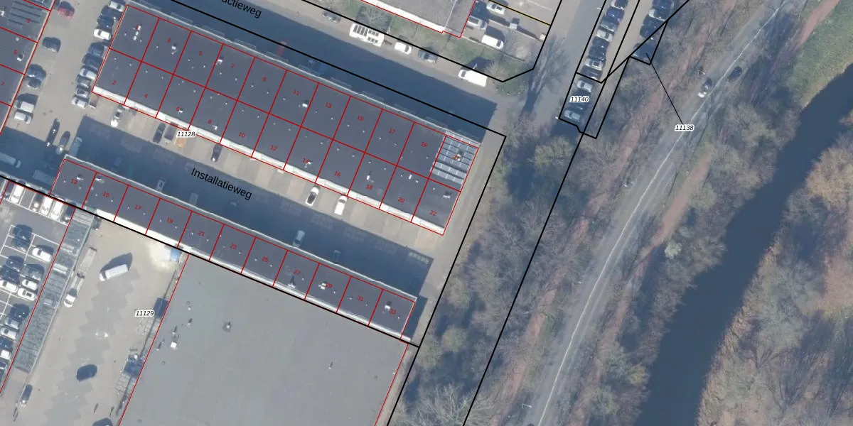 Het perceel waarop Installatieweg 22 staat heeft een oppervlakte van 7636 m². Dit is een zeer groot perceel. De perceeloppervlakte wordt geregistreerd door het Kadaster. Gedetailleerde informatie over de maten van dit perceel kunt u vinden in het rapport Kadastrale kaart met maatvoering van Installatieweg 22.