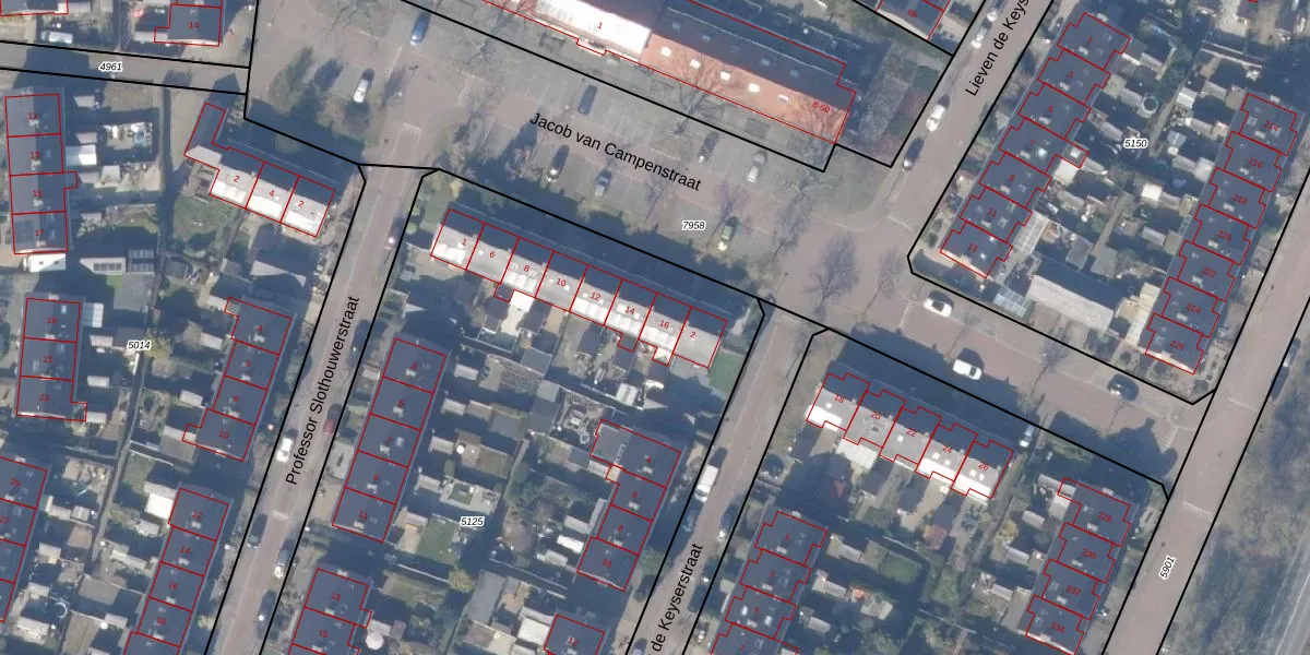 Het perceel waarop Jacob van Campenstraat 16 staat heeft een oppervlakte van 4813 m². Dit is een zeer groot perceel. De perceeloppervlakte wordt geregistreerd door het Kadaster. Gedetailleerde informatie over de maten van dit perceel kunt u vinden in het rapport Kadastrale kaart met maatvoering van Jacob van Campenstraat 16.