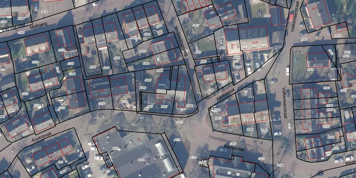 Kerkstraat 53 is gelegen op kadastraal perceel HZN00D3906. Deze kadastrale aanduiding is uniek en wordt gebruikt door het Kadaster om eigendomsrechten en andere zakelijke rechten vast te leggen. Het perceel maakt onderdeel uit van de kadastrale gemeente Huizen.