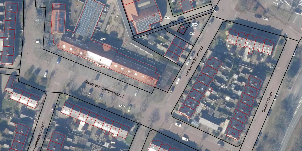 Het perceel waarop Lieven de Keystraat 8 staat heeft een oppervlakte van 3529 m². Dit is een zeer groot perceel. De perceeloppervlakte wordt geregistreerd door het Kadaster. Gedetailleerde informatie over de maten van dit perceel kunt u vinden in het rapport Kadastrale kaart met maatvoering van Lieven de Keystraat 8.