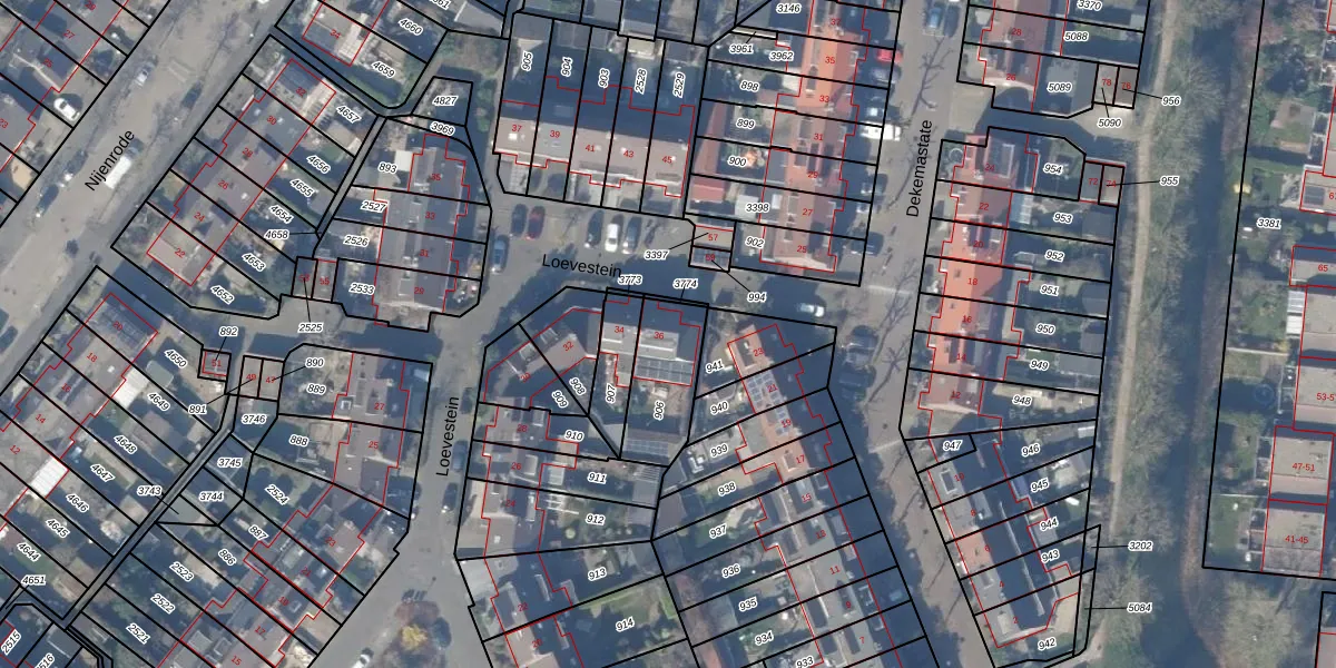 Het perceel waarop Loevestein 36 staat heeft een oppervlakte van 224 m². Dit is een middelgroot perceel. De perceeloppervlakte wordt geregistreerd door het Kadaster. Gedetailleerde informatie over de maten van dit perceel kunt u vinden in het rapport Kadastrale kaart met maatvoering van Loevestein 36.