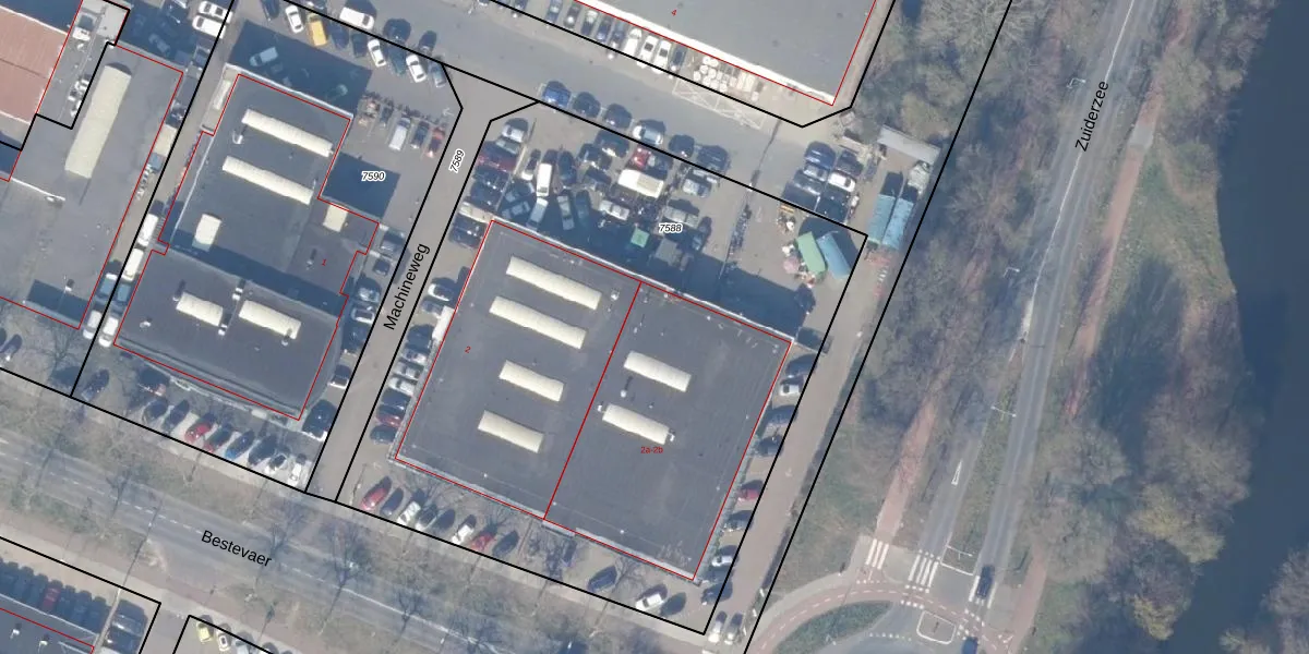 Machineweg 2-b is gelegen op kadastraal perceel HZN00C7588. Deze kadastrale aanduiding is uniek en wordt gebruikt door het Kadaster om eigendomsrechten en andere zakelijke rechten vast te leggen. Het perceel maakt onderdeel uit van de kadastrale gemeente Huizen.