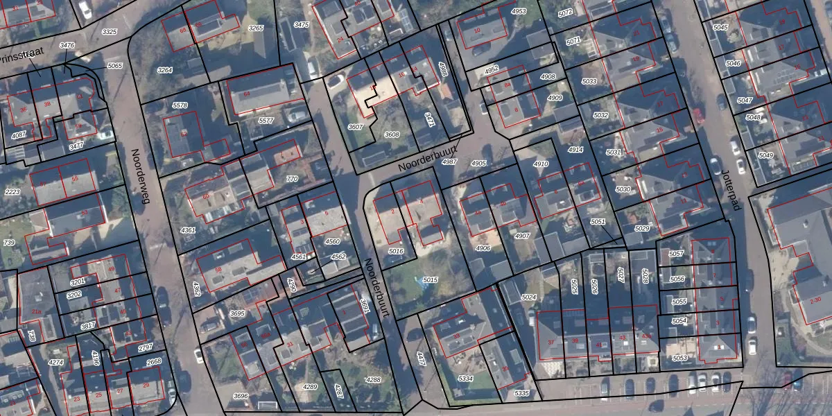 Het perceel waarop Noorderbuurt 4 staat heeft een oppervlakte van 475 m². Dit is een groot perceel. De perceeloppervlakte wordt geregistreerd door het Kadaster. Gedetailleerde informatie over de maten van dit perceel kunt u vinden in het rapport Kadastrale kaart met maatvoering van Noorderbuurt 4.