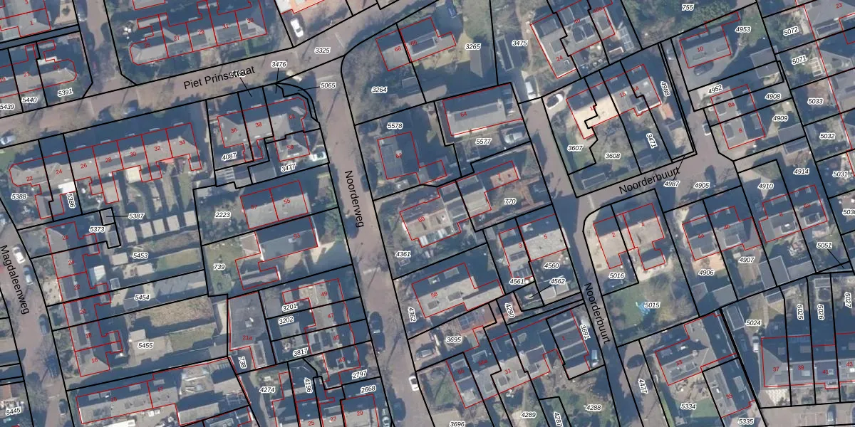Het perceel waarop Noorderweg 60 staat heeft een oppervlakte van 383 m². Dit is een groot perceel. De perceeloppervlakte wordt geregistreerd door het Kadaster. Gedetailleerde informatie over de maten van dit perceel kunt u vinden in het rapport Kadastrale kaart met maatvoering van Noorderweg 60.