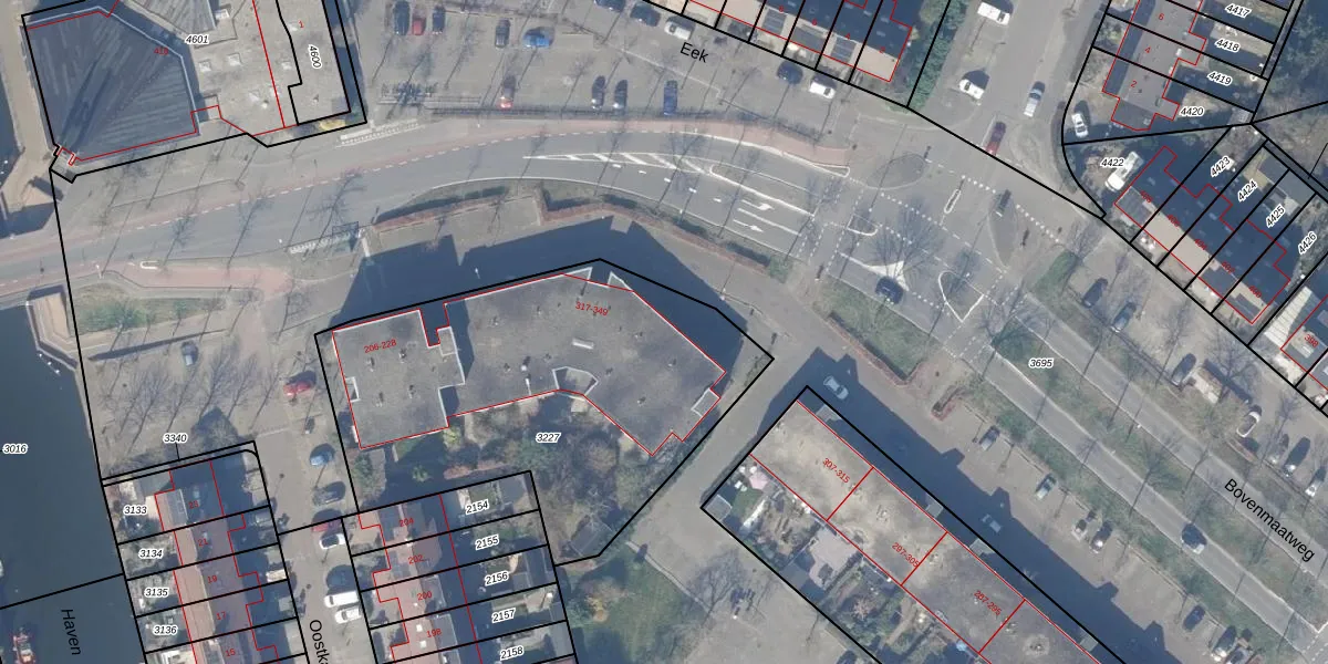 Het perceel waarop het adres ligt is HZN00-E-3227. De afkorting 'HZN00' staat voor kadastrale gemeente Huizen. De gemiddelde perceeloppervlakte in de kadastrale gemeente Huizen is 1437,02 m². Dit perceel is met zijn 1925 m² dus groter dan gemiddeld. Het kleinste perceel in de kadastrale gemeente is 0 m² groot. De grootste perceeloppervlakte is 4,26 km². Op het perceel liggen in totaal 56 adressen. In de Basisregistratie Kadaster (BRK) werden de grenzen van het perceel geregistreerd op 22-06-2000.