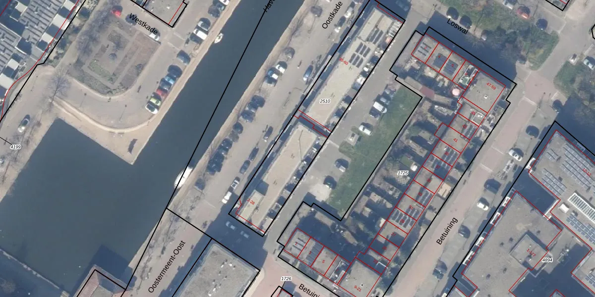 Het perceel waarop Oostkade 26 staat heeft een oppervlakte van 1210 m². Dit is een zeer groot perceel. De perceeloppervlakte wordt geregistreerd door het Kadaster. Gedetailleerde informatie over de maten van dit perceel kunt u vinden in het rapport Kadastrale kaart met maatvoering van Oostkade 26.