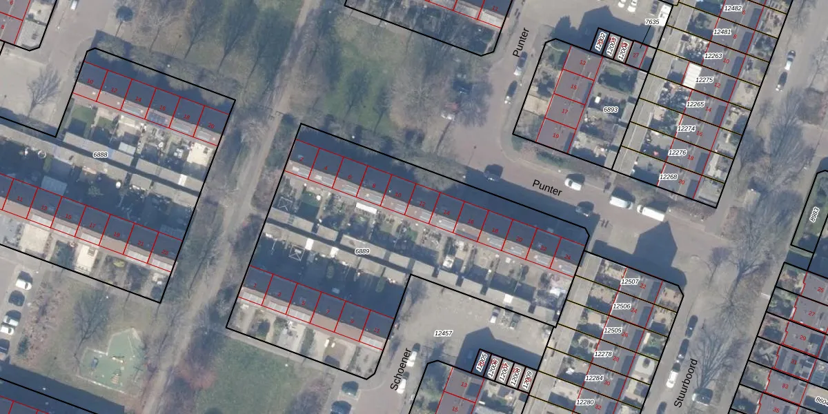 Punter 12 is gelegen op kadastraal perceel HZN00C6889. Deze kadastrale aanduiding is uniek en wordt gebruikt door het Kadaster om eigendomsrechten en andere zakelijke rechten vast te leggen. Het perceel maakt onderdeel uit van de kadastrale gemeente Huizen.