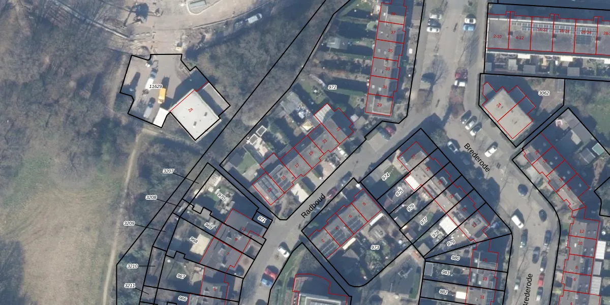 Het perceel waarop Radboud 19 staat heeft een oppervlakte van 2405 m². Dit is een zeer groot perceel. De perceeloppervlakte wordt geregistreerd door het Kadaster. Gedetailleerde informatie over de maten van dit perceel kunt u vinden in het rapport Kadastrale kaart met maatvoering van Radboud 19.