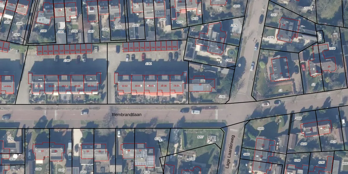 Het perceel waarop Rembrandtlaan 24 staat heeft een oppervlakte van 1685 m². Dit is een zeer groot perceel. De perceeloppervlakte wordt geregistreerd door het Kadaster. Gedetailleerde informatie over de maten van dit perceel kunt u vinden in het rapport Kadastrale kaart met maatvoering van Rembrandtlaan 24.