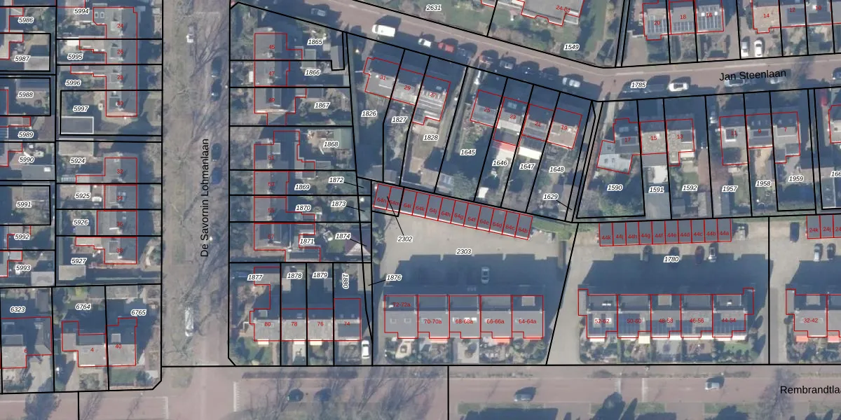 Het perceel waarop Rembrandtlaan 64-k staat heeft een oppervlakte van 1728 m². Dit is een zeer groot perceel. De perceeloppervlakte wordt geregistreerd door het Kadaster. Gedetailleerde informatie over de maten van dit perceel kunt u vinden in het rapport Kadastrale kaart met maatvoering van Rembrandtlaan 64-k.
