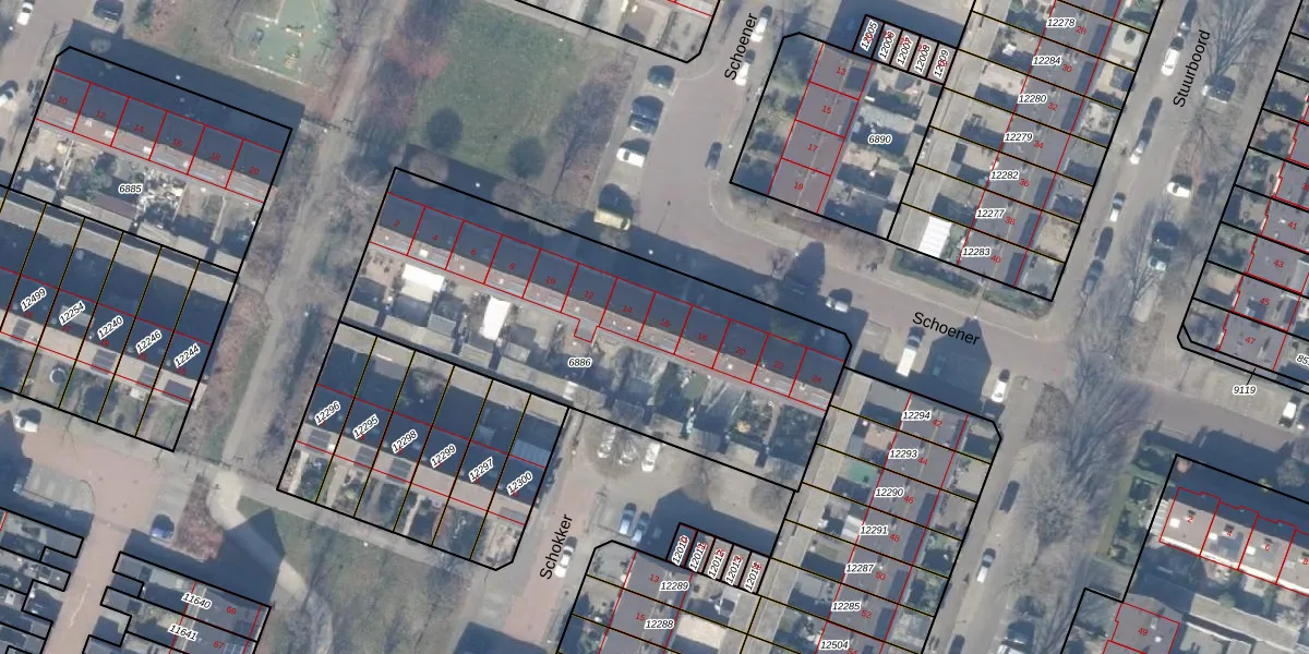 Het perceel waarop Schoener 16 staat heeft een oppervlakte van 1876 m². Dit is een zeer groot perceel. De perceeloppervlakte wordt geregistreerd door het Kadaster. Gedetailleerde informatie over de maten van dit perceel kunt u vinden in het rapport Kadastrale kaart met maatvoering van Schoener 16.