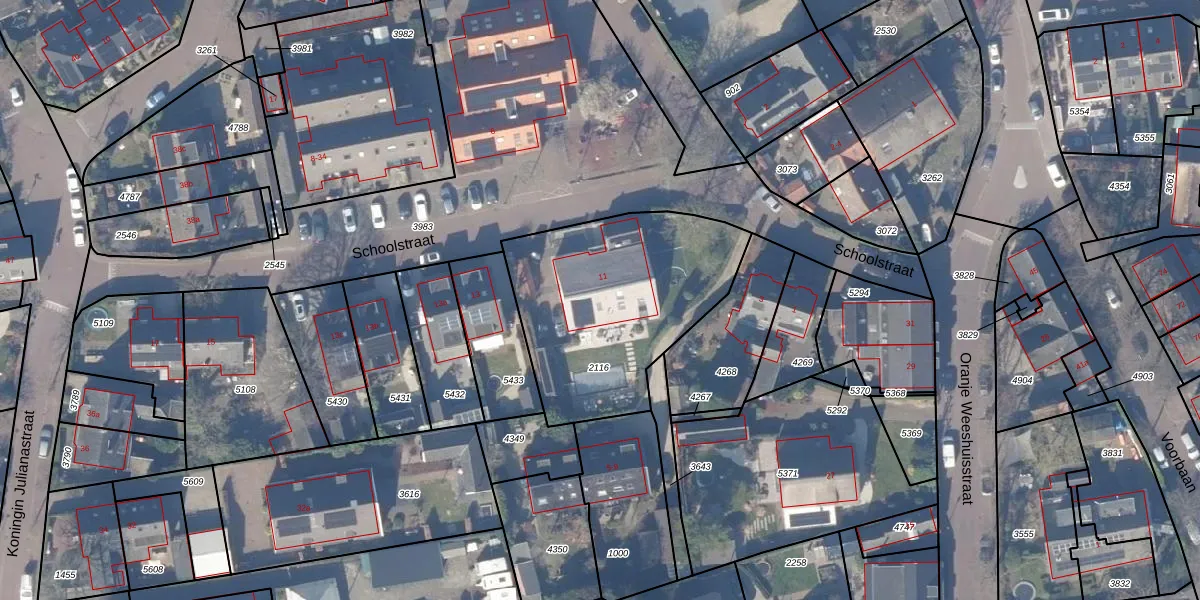 Het perceel waarop Schoolstraat 11 staat heeft een oppervlakte van 951 m². Dit is een groot perceel. De perceeloppervlakte wordt geregistreerd door het Kadaster. Gedetailleerde informatie over de maten van dit perceel kunt u vinden in het rapport Kadastrale kaart met maatvoering van Schoolstraat 11.