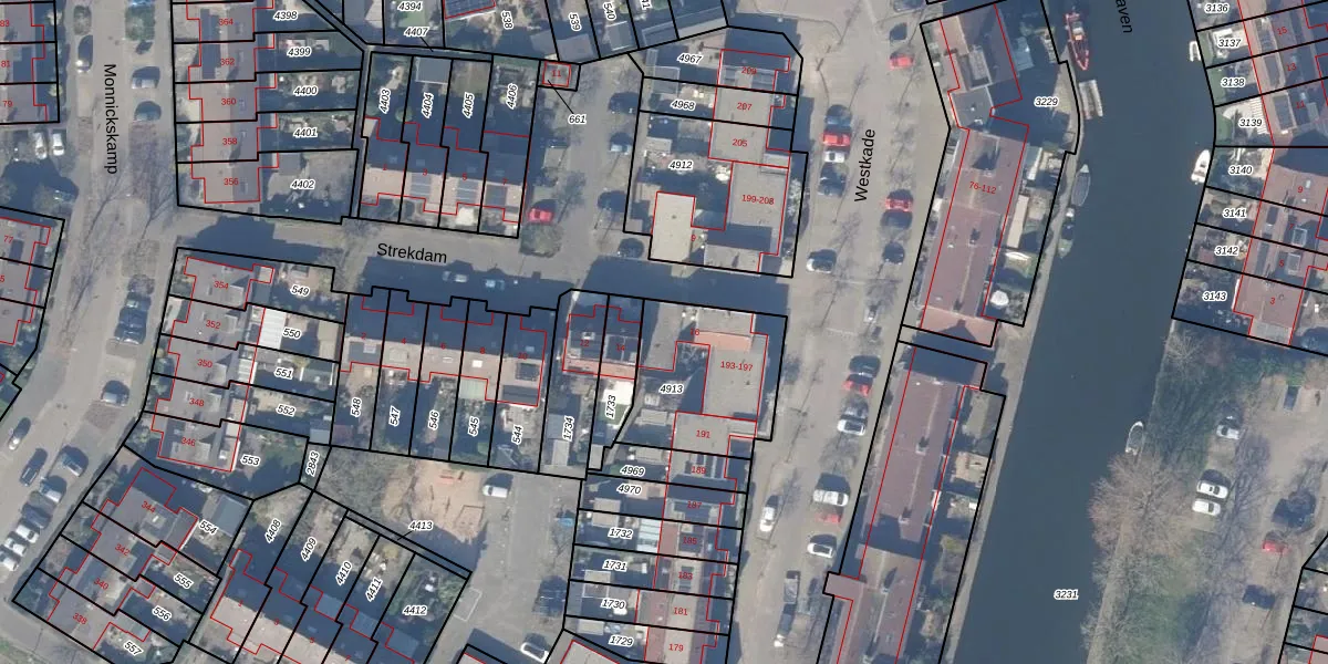Het perceel waarop Strekdam 16 staat heeft een oppervlakte van 470 m². Dit is een groot perceel. De perceeloppervlakte wordt geregistreerd door het Kadaster. Gedetailleerde informatie over de maten van dit perceel kunt u vinden in het rapport Kadastrale kaart met maatvoering van Strekdam 16.