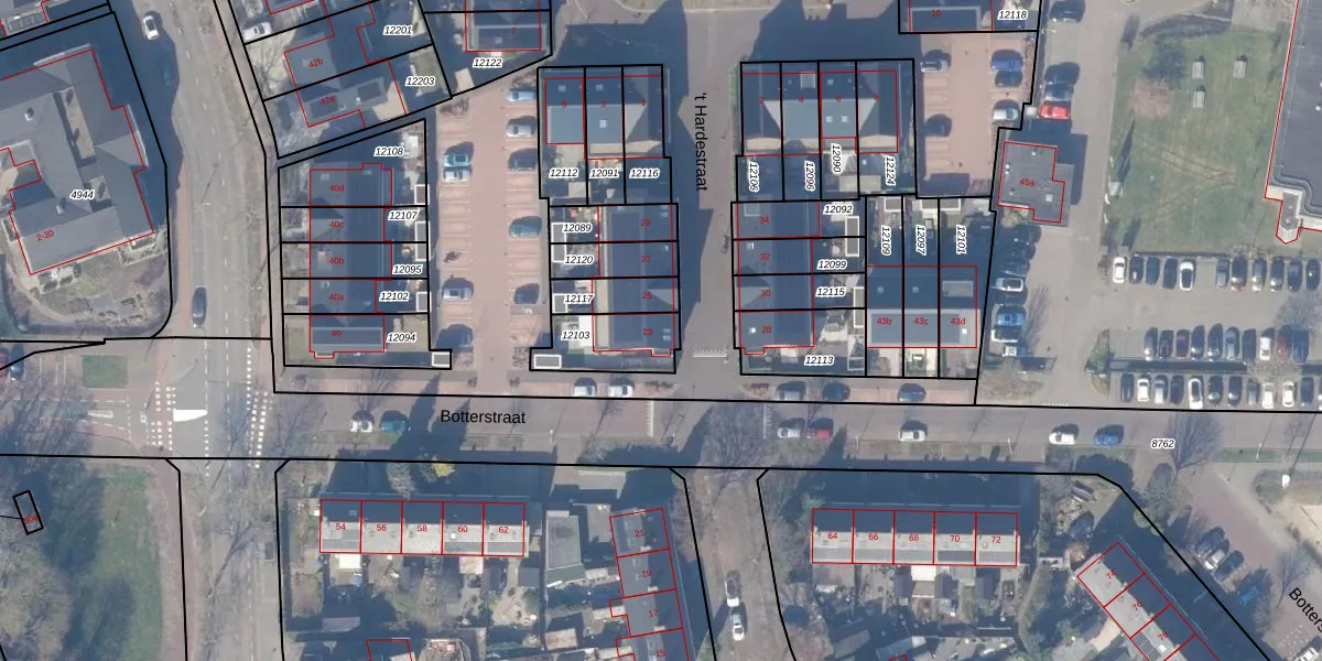 't Hardestraat 23 is gelegen op kadastraal perceel HZN00C12103. Deze kadastrale aanduiding is uniek en wordt gebruikt door het Kadaster om eigendomsrechten en andere zakelijke rechten vast te leggen. Het perceel maakt onderdeel uit van de kadastrale gemeente Huizen.