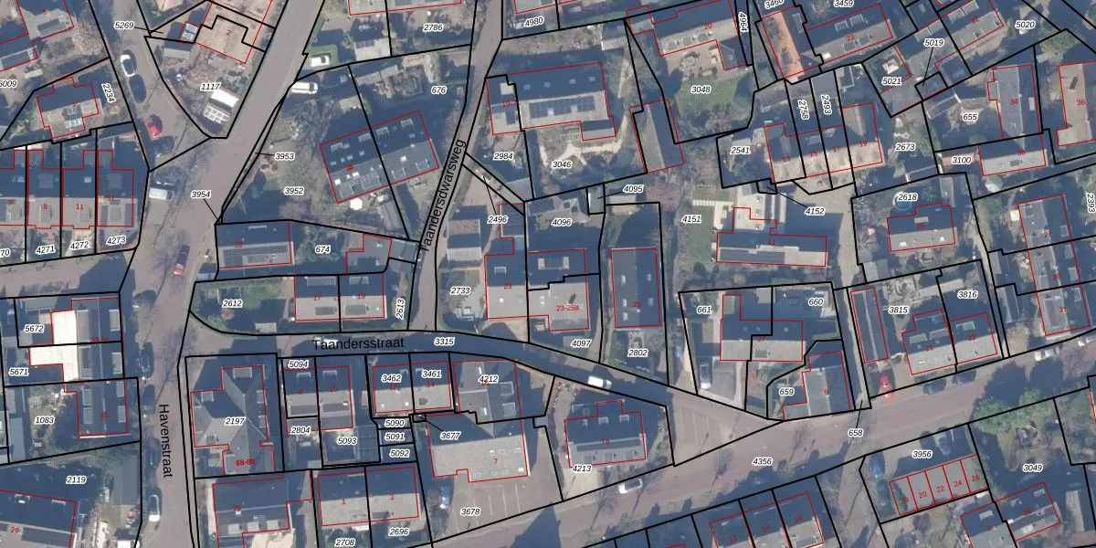 Taandersstraat 25-a is gelegen op kadastraal perceel HZN00D4096. Deze kadastrale aanduiding is uniek en wordt gebruikt door het Kadaster om eigendomsrechten en andere zakelijke rechten vast te leggen. Het perceel maakt onderdeel uit van de kadastrale gemeente Huizen.