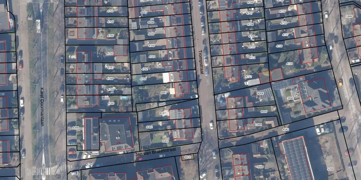 Het perceel waarop Trompstraat 19 staat heeft een oppervlakte van 373 m². Dit is een groot perceel. De perceeloppervlakte wordt geregistreerd door het Kadaster. Gedetailleerde informatie over de maten van dit perceel kunt u vinden in het rapport Kadastrale kaart met maatvoering van Trompstraat 19.