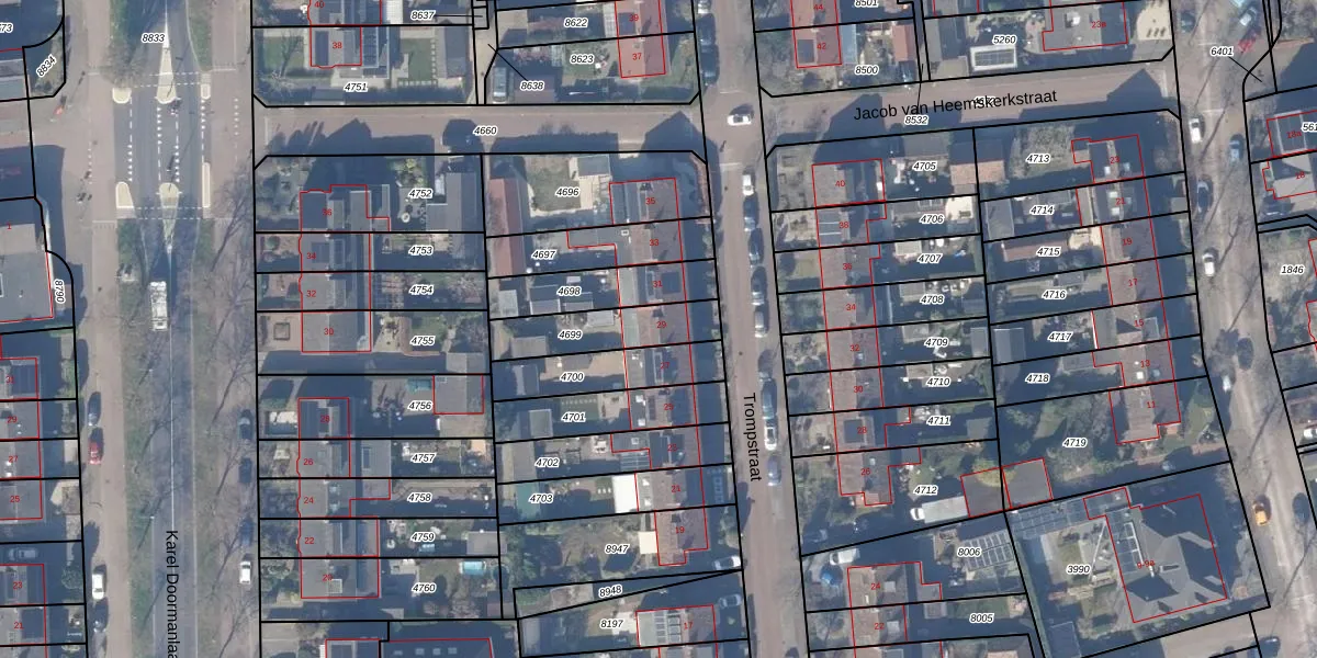 Het perceel waarop Trompstraat 29 staat heeft een oppervlakte van 221 m². Dit is een middelgroot perceel. De perceeloppervlakte wordt geregistreerd door het Kadaster. Gedetailleerde informatie over de maten van dit perceel kunt u vinden in het rapport Kadastrale kaart met maatvoering van Trompstraat 29.