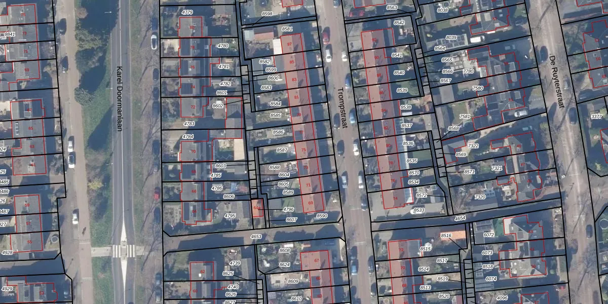 Het perceel waarop Trompstraat 75 staat heeft een oppervlakte van 145 m². Dit is een middelgroot perceel. De perceeloppervlakte wordt geregistreerd door het Kadaster. Gedetailleerde informatie over de maten van dit perceel kunt u vinden in het rapport Kadastrale kaart met maatvoering van Trompstraat 75.