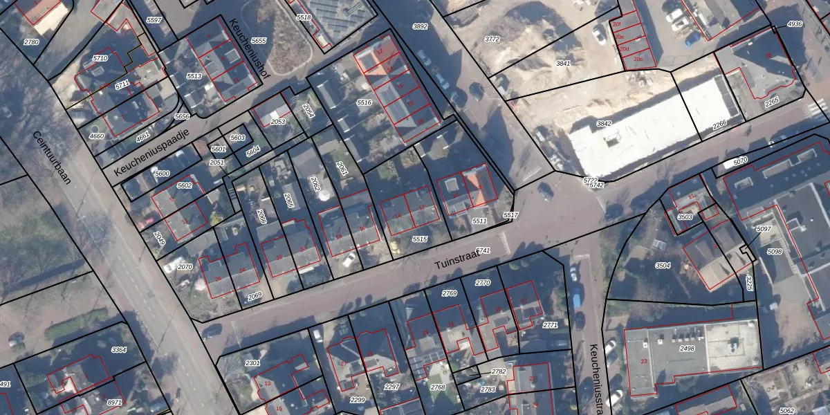 Tuinstraat 12 is gelegen op kadastraal perceel HZN00D5515. Deze kadastrale aanduiding is uniek en wordt gebruikt door het Kadaster om eigendomsrechten en andere zakelijke rechten vast te leggen. Het perceel maakt onderdeel uit van de kadastrale gemeente Huizen.