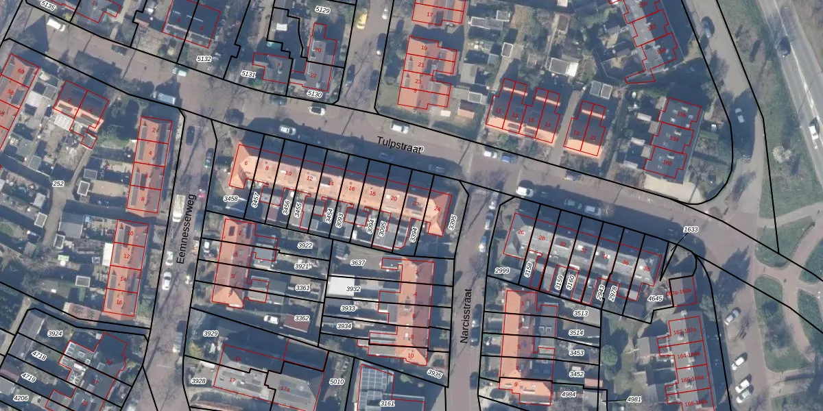 Gebruik de zoekbalk of klik op een perceel voor informatie over de adressen binnen dit perceel.