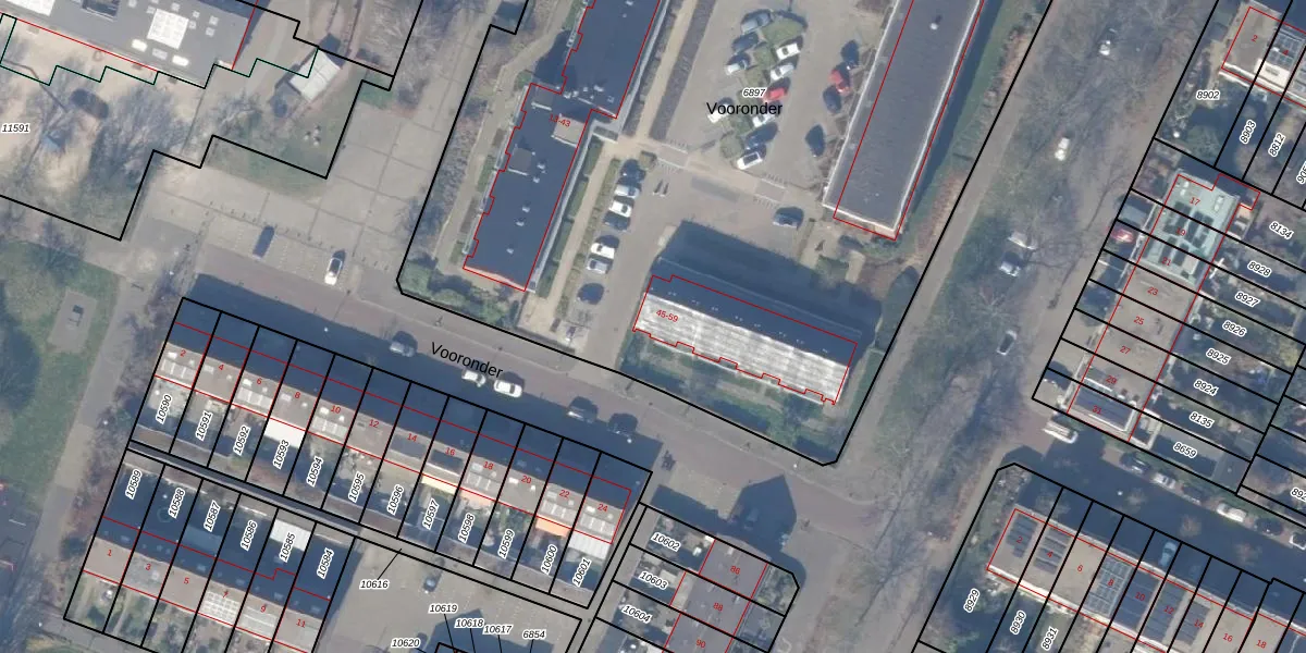 Vooronder 45 is gelegen op kadastraal perceel HZN00C6897. Deze kadastrale aanduiding is uniek en wordt gebruikt door het Kadaster om eigendomsrechten en andere zakelijke rechten vast te leggen. Het perceel maakt onderdeel uit van de kadastrale gemeente Huizen.