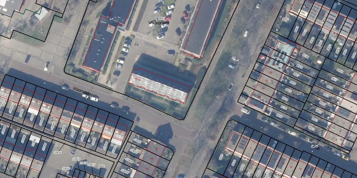 Het perceel waarop Vooronder 59 staat heeft een oppervlakte van 7162 m². Dit is een zeer groot perceel. De perceeloppervlakte wordt geregistreerd door het Kadaster. Gedetailleerde informatie over de maten van dit perceel kunt u vinden in het rapport Kadastrale kaart met maatvoering van Vooronder 59.