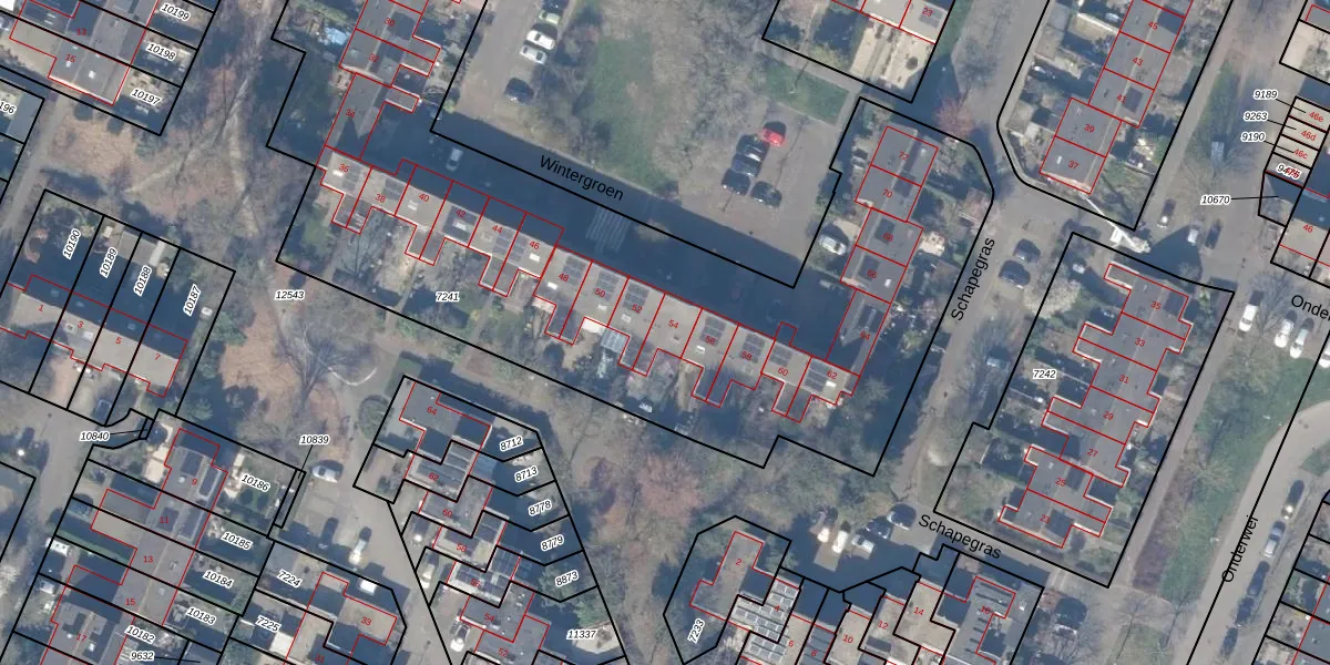 Wintergroen 54 is gelegen op kadastraal perceel HZN00C7241. Deze kadastrale aanduiding is uniek en wordt gebruikt door het Kadaster om eigendomsrechten en andere zakelijke rechten vast te leggen. Het perceel maakt onderdeel uit van de kadastrale gemeente Huizen.