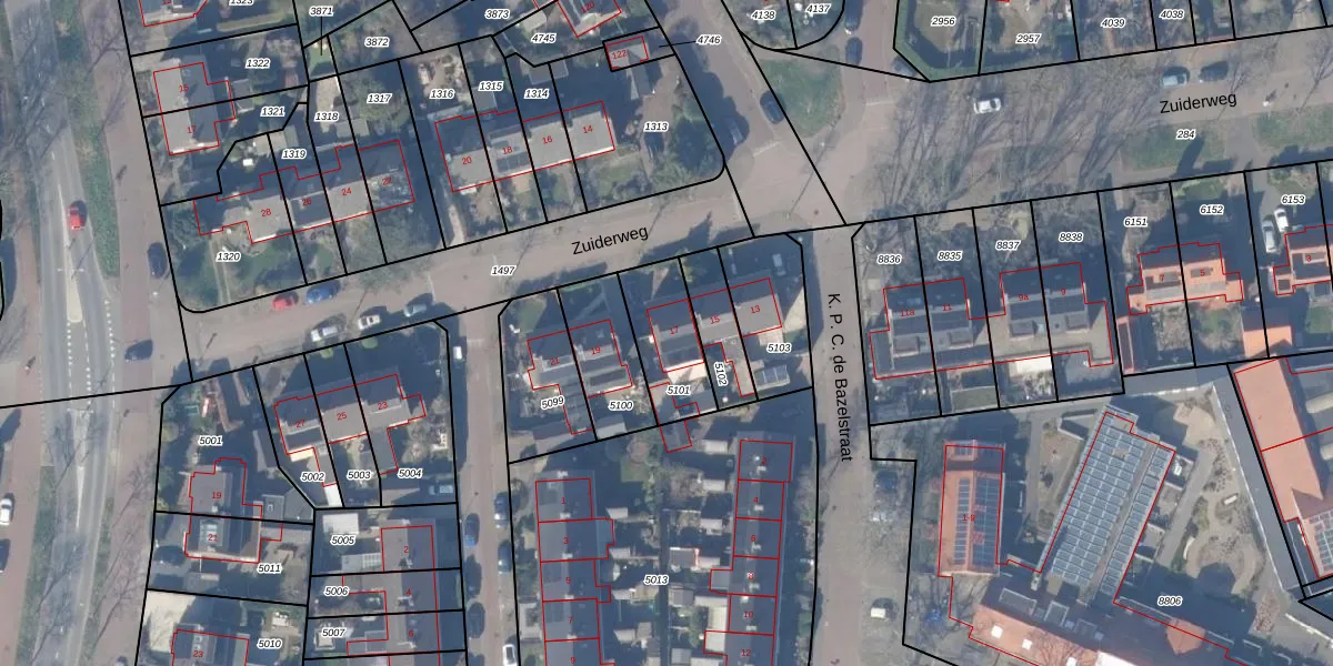 Zuiderweg 17 is gelegen op kadastraal perceel HZN00B5101. Deze kadastrale aanduiding is uniek en wordt gebruikt door het Kadaster om eigendomsrechten en andere zakelijke rechten vast te leggen. Het perceel maakt onderdeel uit van de kadastrale gemeente Huizen.