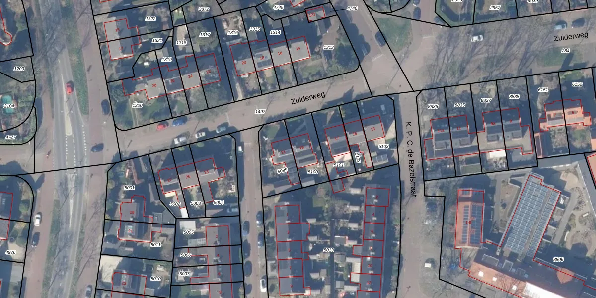 Zuiderweg 19 is gelegen op kadastraal perceel HZN00B5100. Deze kadastrale aanduiding is uniek en wordt gebruikt door het Kadaster om eigendomsrechten en andere zakelijke rechten vast te leggen. Het perceel maakt onderdeel uit van de kadastrale gemeente Huizen.