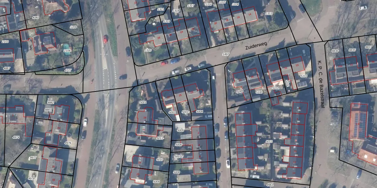 Zuiderweg 23 is gelegen op kadastraal perceel HZN00B5004. Deze kadastrale aanduiding is uniek en wordt gebruikt door het Kadaster om eigendomsrechten en andere zakelijke rechten vast te leggen. Het perceel maakt onderdeel uit van de kadastrale gemeente Huizen.