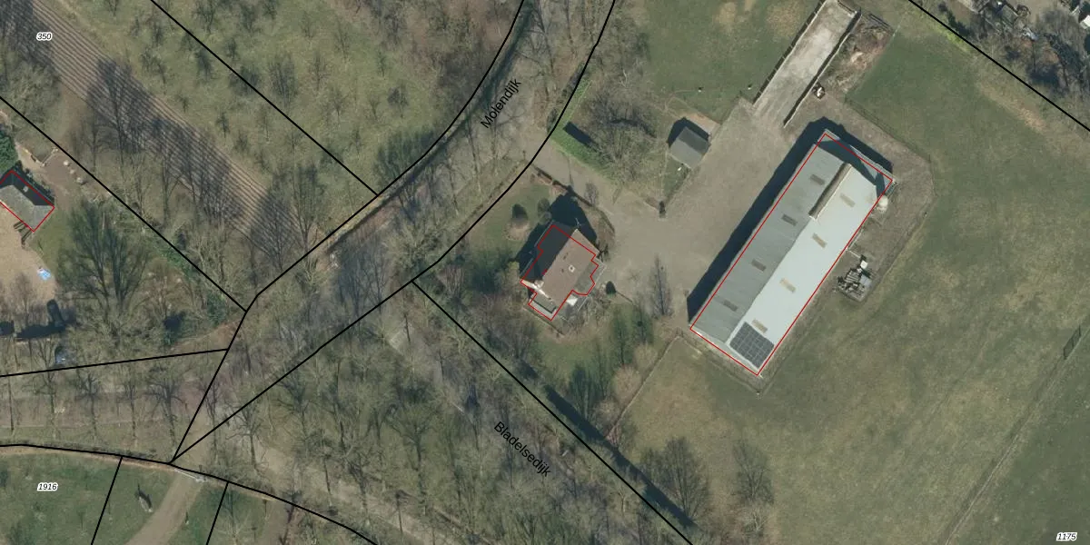 Het perceel waarop Molendijk 2 staat heeft een oppervlakte van 2,0 ha. Dit is een zeer groot perceel. De perceeloppervlakte wordt geregistreerd door het Kadaster. Gedetailleerde informatie over de maten van dit perceel kunt u vinden in het rapport Kadastrale kaart met maatvoering van Molendijk 2.