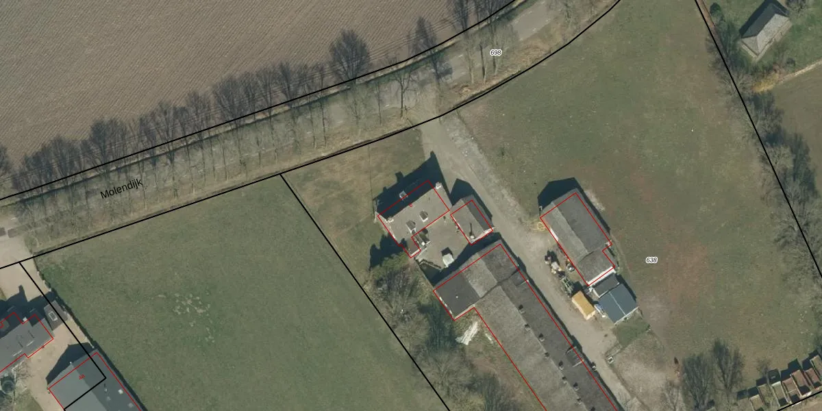 Het perceel waarop Molendijk 6 staat heeft een oppervlakte van 1,0 ha. Dit is een zeer groot perceel. De perceeloppervlakte wordt geregistreerd door het Kadaster. Gedetailleerde informatie over de maten van dit perceel kunt u vinden in het rapport Kadastrale kaart met maatvoering van Molendijk 6.