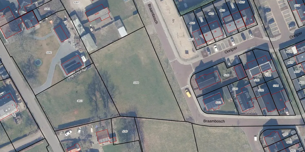 Het perceel waarop Braambosch 16 staat heeft een oppervlakte van 2195 m². Dit is een zeer groot perceel. De perceeloppervlakte wordt geregistreerd door het Kadaster. Gedetailleerde informatie over de maten van dit perceel kunt u vinden in het rapport Kadastrale kaart met maatvoering van Braambosch 16.