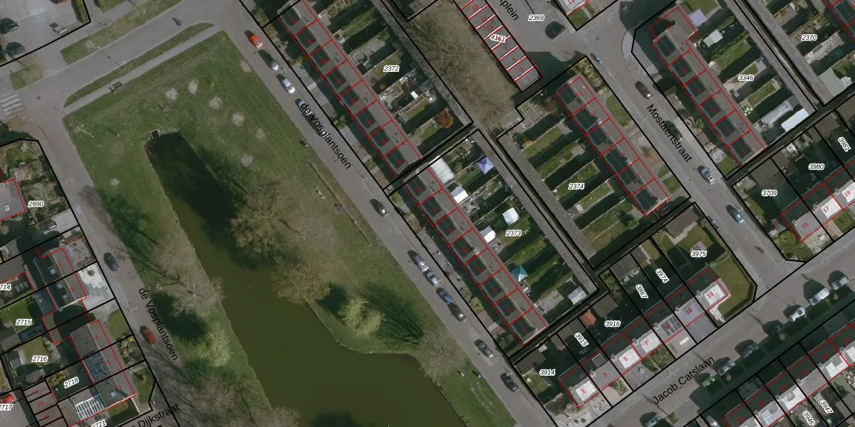 Het perceel waarop de Vosplantsoen 14 staat heeft een oppervlakte van 1262 m². Dit is een zeer groot perceel. De perceeloppervlakte wordt geregistreerd door het Kadaster. Gedetailleerde informatie over de maten van dit perceel kunt u vinden in het rapport Kadastrale kaart met maatvoering van de Vosplantsoen 14.