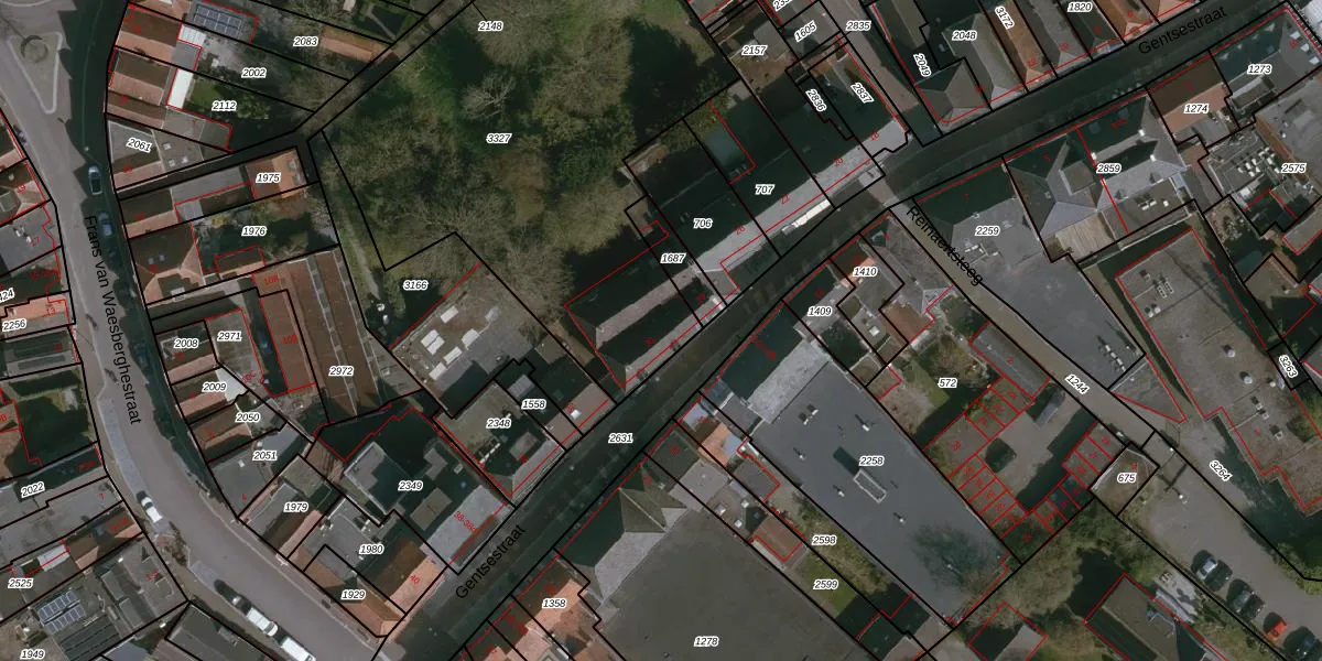 Het perceel waarop Gentsestraat 30 staat heeft een oppervlakte van 2472 m². Dit is een zeer groot perceel. De perceeloppervlakte wordt geregistreerd door het Kadaster. Gedetailleerde informatie over de maten van dit perceel kunt u vinden in het rapport Kadastrale kaart met maatvoering van Gentsestraat 30.