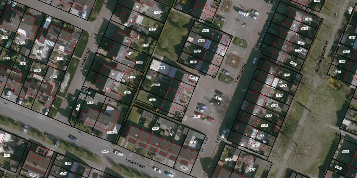 Het perceel waarop Liniestraat 89 staat heeft een oppervlakte van 348 m². Dit is een groot perceel. De perceeloppervlakte wordt geregistreerd door het Kadaster. Gedetailleerde informatie over de maten van dit perceel kunt u vinden in het rapport Kadastrale kaart met maatvoering van Liniestraat 89.