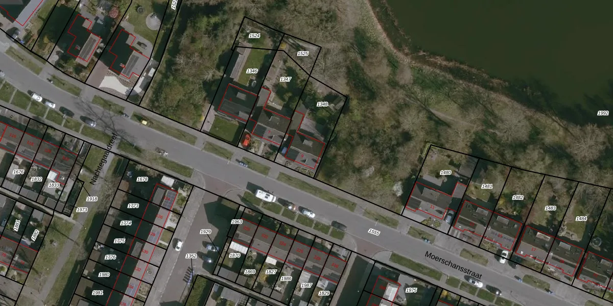 Het perceel waarop Moerschansstraat 9 staat heeft een oppervlakte van 415 m². Dit is een groot perceel. De perceeloppervlakte wordt geregistreerd door het Kadaster. Gedetailleerde informatie over de maten van dit perceel kunt u vinden in het rapport Kadastrale kaart met maatvoering van Moerschansstraat 9.