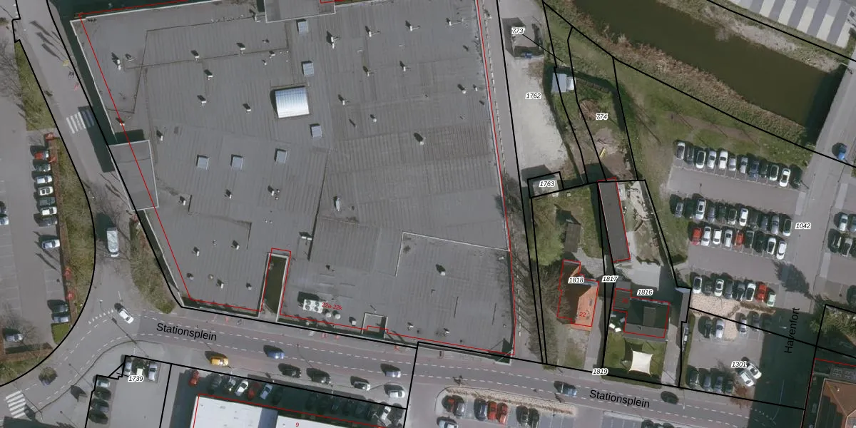 Het perceel waarop Stationsplein 22-h staat heeft een oppervlakte van 1,6 ha. Dit is een zeer groot perceel. De perceeloppervlakte wordt geregistreerd door het Kadaster. Gedetailleerde informatie over de maten van dit perceel kunt u vinden in het rapport Kadastrale kaart met maatvoering van Stationsplein 22-h.