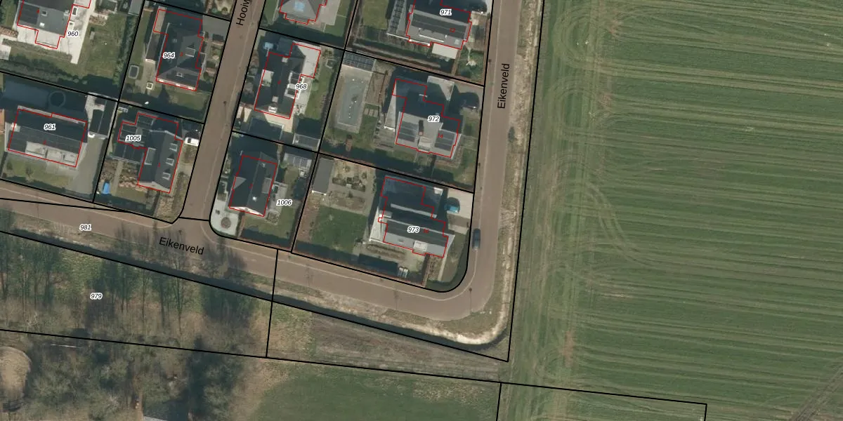 Het perceel waarop Eikenveld 16 staat heeft een oppervlakte van 985 m². Dit is een groot perceel. De perceeloppervlakte wordt geregistreerd door het Kadaster. Gedetailleerde informatie over de maten van dit perceel kunt u vinden in het rapport Kadastrale kaart met maatvoering van Eikenveld 16.