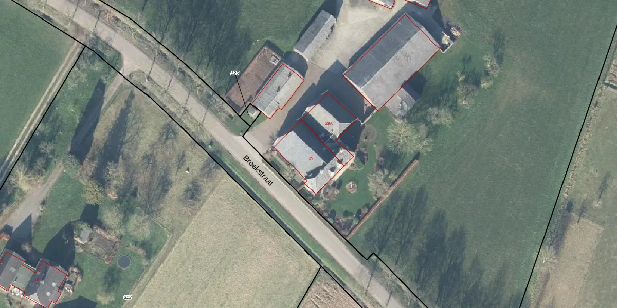 Het perceel waarop Broekstraat 29 staat heeft een oppervlakte van 2,9 ha. Dit is een zeer groot perceel. De perceeloppervlakte wordt geregistreerd door het Kadaster. Gedetailleerde informatie over de maten van dit perceel kunt u vinden in het rapport Kadastrale kaart met maatvoering van Broekstraat 29.