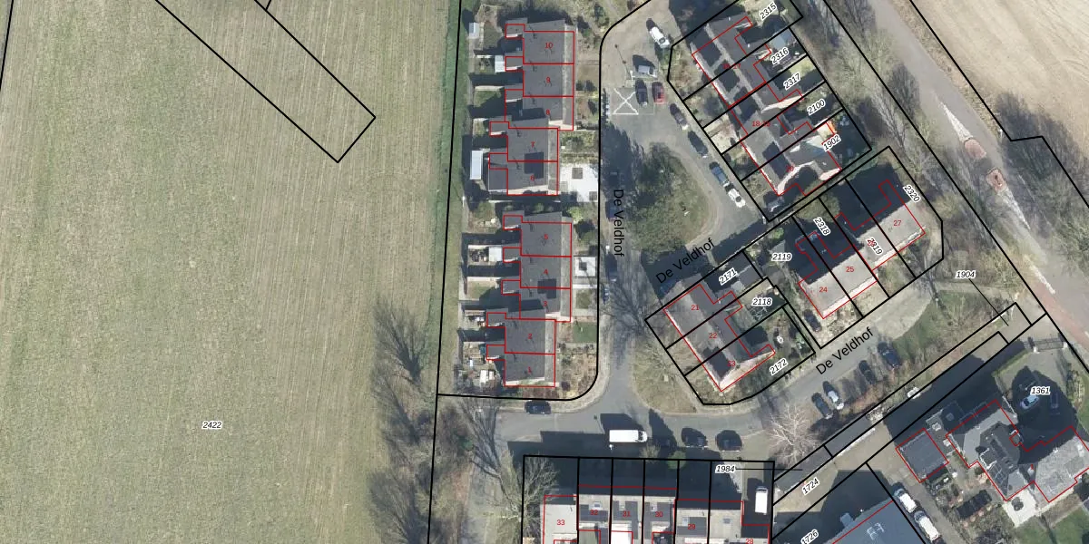 Het perceel waarop De Veldhof 4 staat heeft een oppervlakte van 2950 m². Dit is een zeer groot perceel. De perceeloppervlakte wordt geregistreerd door het Kadaster. Gedetailleerde informatie over de maten van dit perceel kunt u vinden in het rapport Kadastrale kaart met maatvoering van De Veldhof 4.