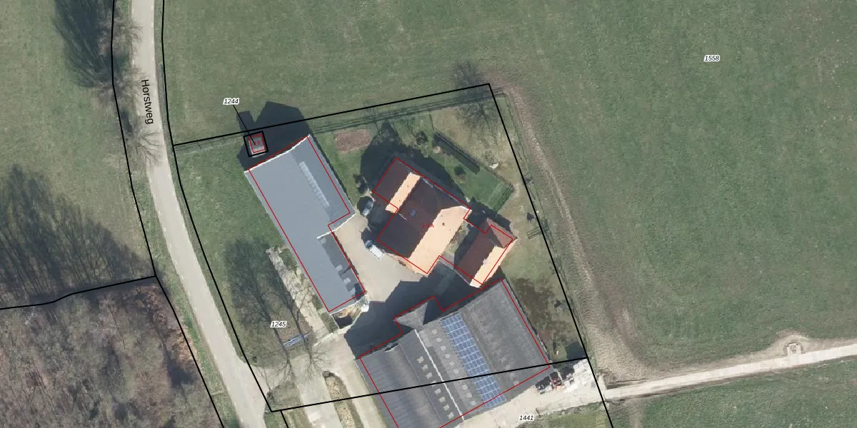 Het perceel waarop Horstweg 1 staat heeft een oppervlakte van 4969 m². Dit is een zeer groot perceel. De perceeloppervlakte wordt geregistreerd door het Kadaster. Gedetailleerde informatie over de maten van dit perceel kunt u vinden in het rapport Kadastrale kaart met maatvoering van Horstweg 1.