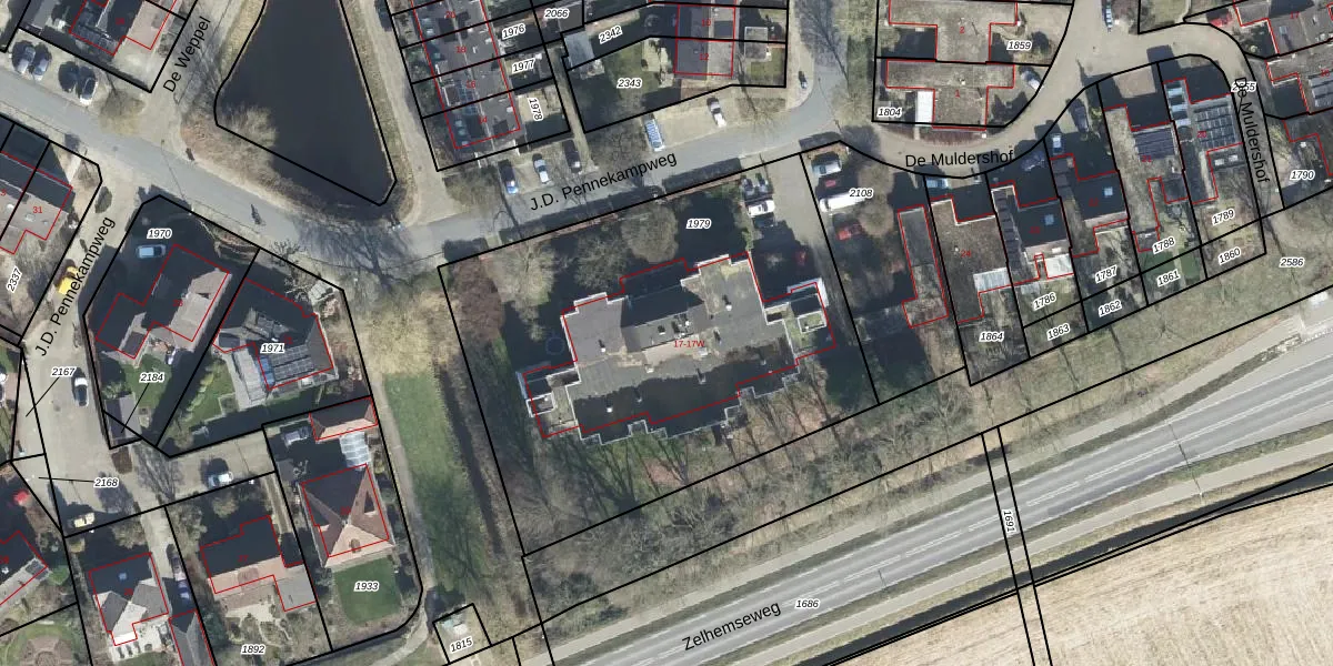 Het perceel waarop J.D. Pennekampweg 17 staat heeft een oppervlakte van 2411 m². Dit is een zeer groot perceel. De perceeloppervlakte wordt geregistreerd door het Kadaster. Gedetailleerde informatie over de maten van dit perceel kunt u vinden in het rapport Kadastrale kaart met maatvoering van J.D. Pennekampweg 17.