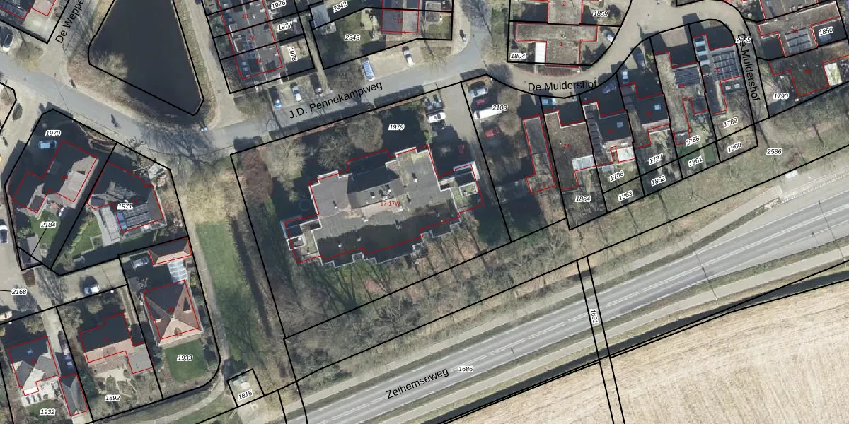 Het perceel waarop J.D. Pennekampweg 17-K staat heeft een oppervlakte van 2411 m². Dit is een zeer groot perceel. De perceeloppervlakte wordt geregistreerd door het Kadaster. Gedetailleerde informatie over de maten van dit perceel kunt u vinden in het rapport Kadastrale kaart met maatvoering van J.D. Pennekampweg 17-K.