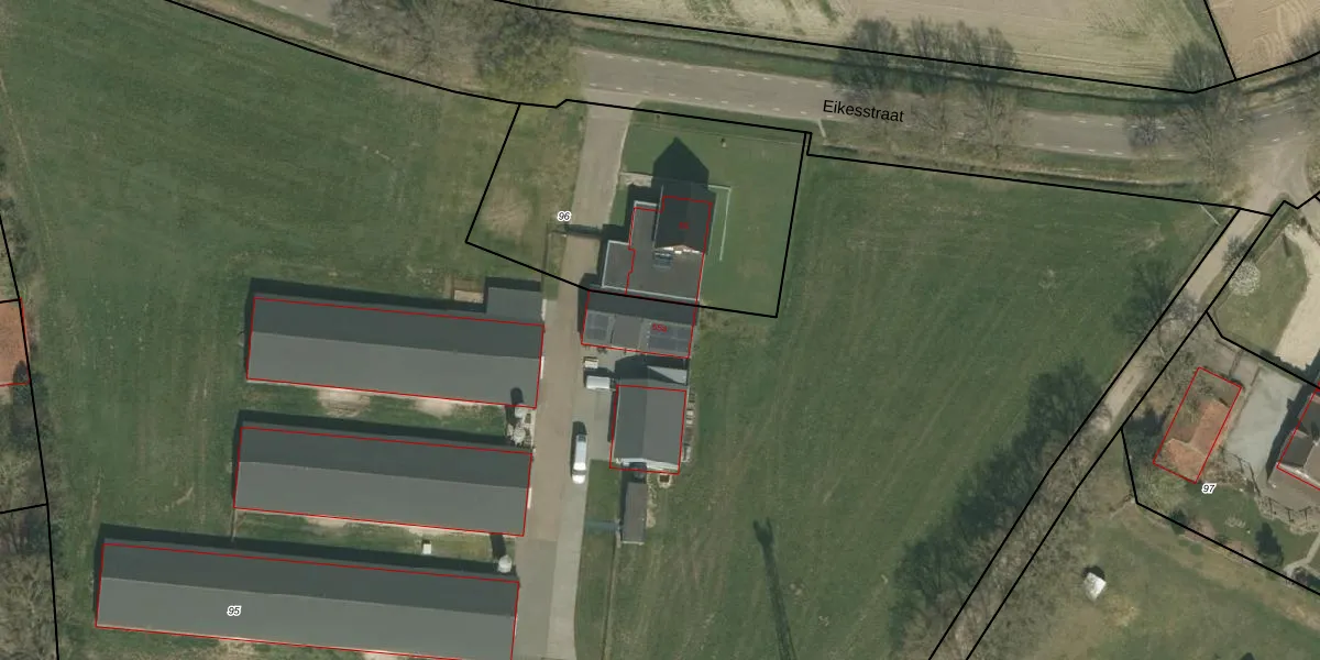 Het perceel waarop Eikesstraat 55-a staat heeft een oppervlakte van 1,7 ha. Dit is een zeer groot perceel. De perceeloppervlakte wordt geregistreerd door het Kadaster. Gedetailleerde informatie over de maten van dit perceel kunt u vinden in het rapport Kadastrale kaart met maatvoering van Eikesstraat 55-a.