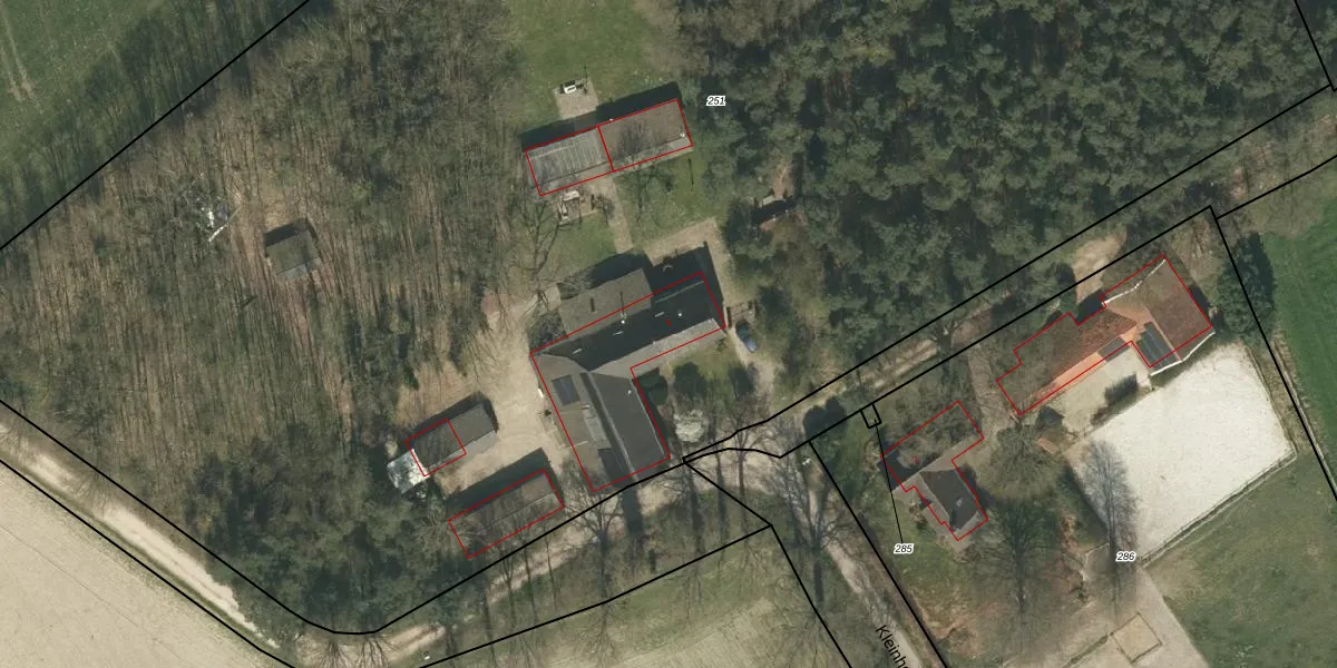 Het perceel waarop Kleinhei 4 staat heeft een oppervlakte van 1,7 ha. Dit is een zeer groot perceel. De perceeloppervlakte wordt geregistreerd door het Kadaster. Gedetailleerde informatie over de maten van dit perceel kunt u vinden in het rapport Kadastrale kaart met maatvoering van Kleinhei 4.